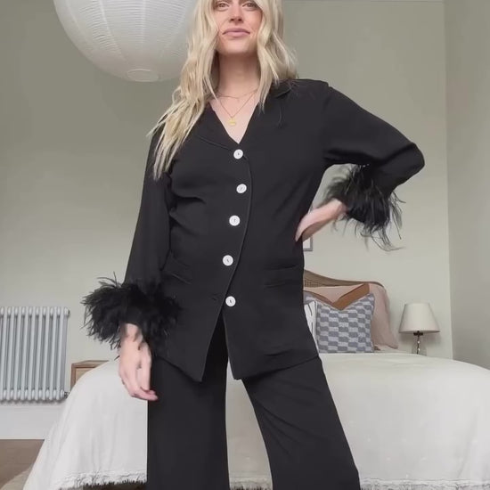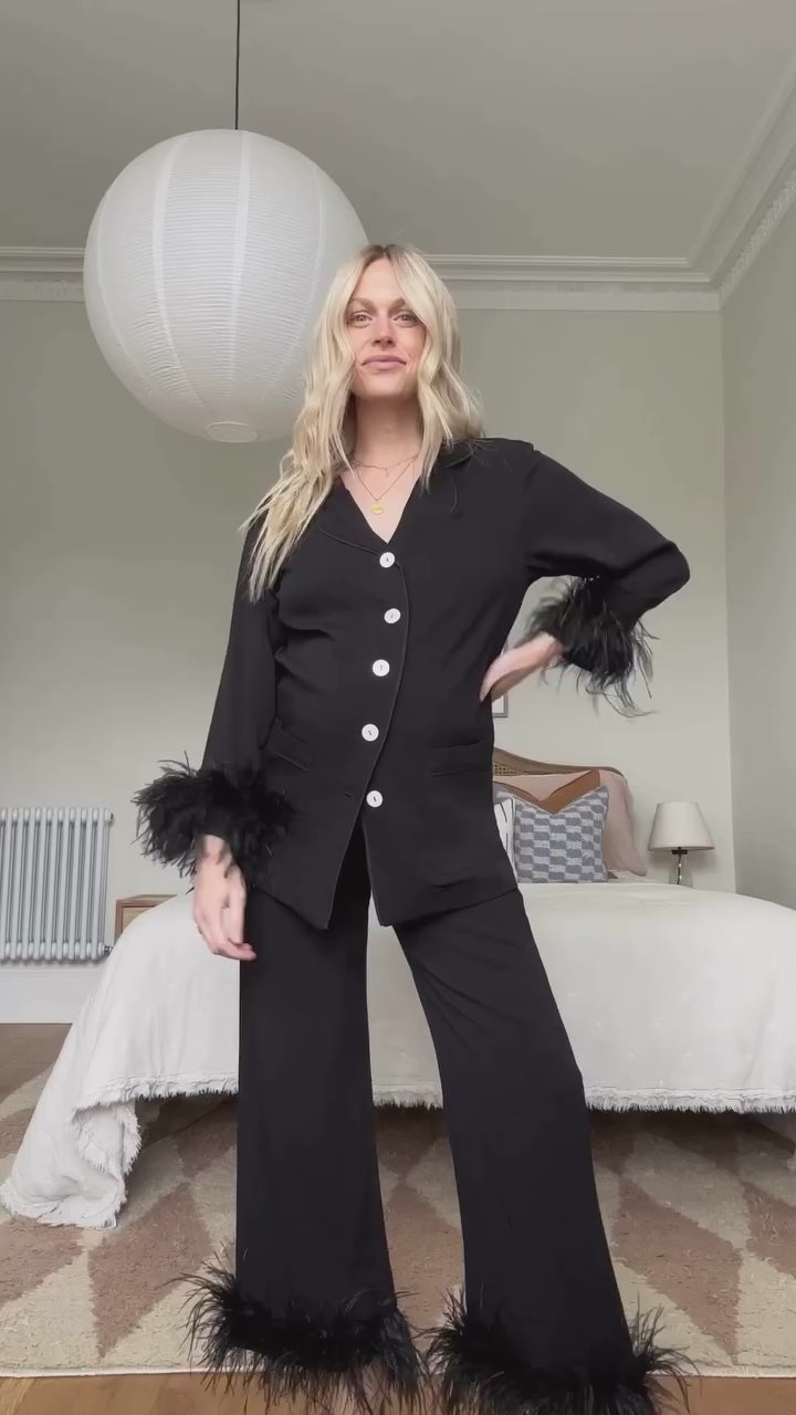 Цей комплект – наша класика, а її попередні версії мають у своєму арсеналі, напевно, більшість сучасних модниць. Комплект чорної піжами з сорочки та штанів, виготовлений із м'якої сертифікованої віскози, доповнений знімними манжетами з подвійним шаром пір'я. Сорочка має укорочені рукави, заокруглений комір з контрастним кантом, злегка укорочені рукави та застібку на ґудзиках, а штани мають зручний еластичний пояс і прямий крій. Цей універсальний комплект чудово поєднується як із домашнім взуттям, так і з елегантними туфлями.