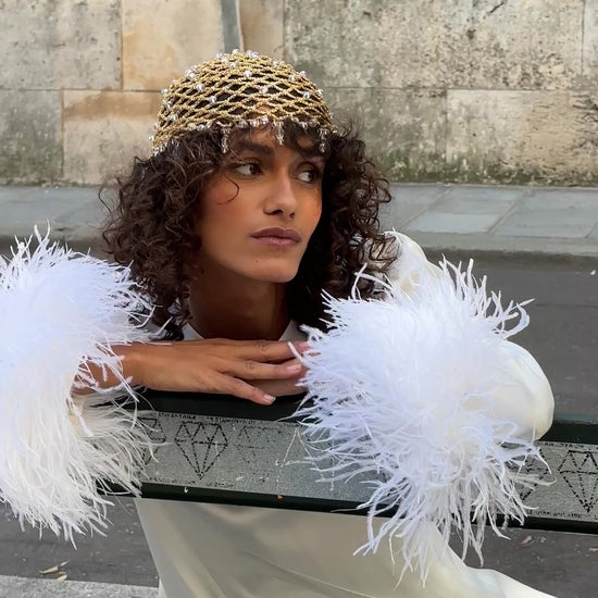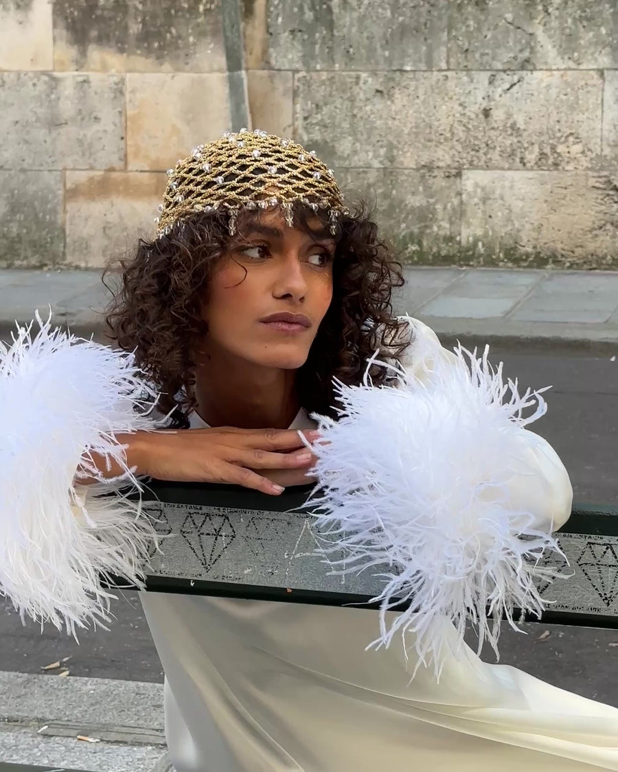 Біла максі-сукня, створена для особливих моментів і не тільки. Вільний силует виконаний із ніжної, дихаючої тканини EcoVero™ rayon, що має сертифікацію STANDARD 100 by OEKO-TEX®. Округлий виріз акуратно застібається ззаду на перламутровий ґудзик, а манжети рукавів прикрашені розкішним шаром знімного страусиного пір’я, додаючи образу елегантності та вишуканості.